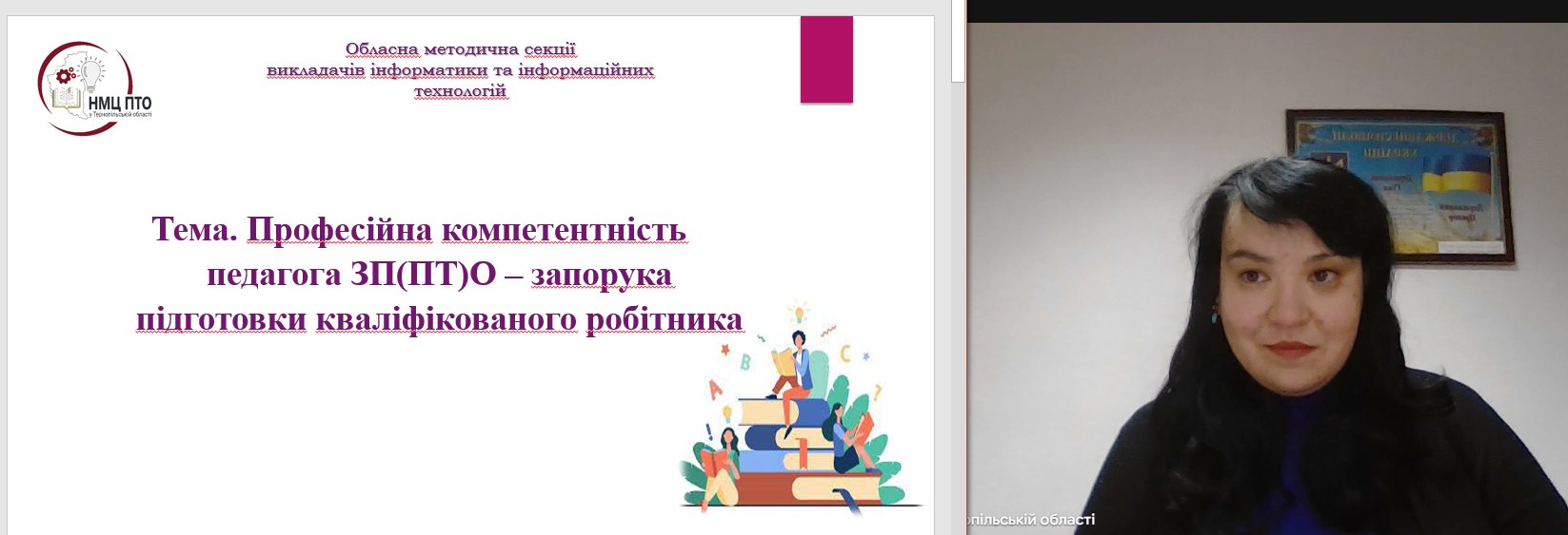 Відповідно до плану НМЦ ПТО у Тернопільській області 30 вересня 2025 року в онлайн-режимі відбулося засідання обласної методичної секції викладачів інформатики та інформаційних технологій закладів професійної освіти на тему «Професійна компетентність педагога ЗП(ПТ)О – запорука підготовки кваліфікованого робітника». Привітала учасників засідання, Ковальчук Оксана, методист НМЦ ПТО у Тернопільській області. Виступила з питанням щодо особливості викладання інформатики та інформаційних технологій у 2025/2026 н.р., звернула увагу колег на нормативно-правові документи. Удич Ольга, методист НМЦ ПТО у Тернопільській області, ознайомила з умовами підвищення кваліфікації педпрацівників професійної освіти з інформатики та інформаційних технологій. Столярчук Світлана, викладач ДНЗ «Шумське професійно-технічне училище», розкрила актуальне питання «Медіаграмотність – шлях до професійної компетенції сучасного педагога». Крива Олена, викладач ДНЗ «Хоростківський професійний сільськогосподарський ліцей», виступила з доповіддю «Академічна доброчесність». Дякуємо спікерам за цікаві та змістовні виступи, бажаємо учасникам творчих успіхів та натхнення. Дякуємо ЗСУ за можливість працювати і проводити такі зустрічі.
